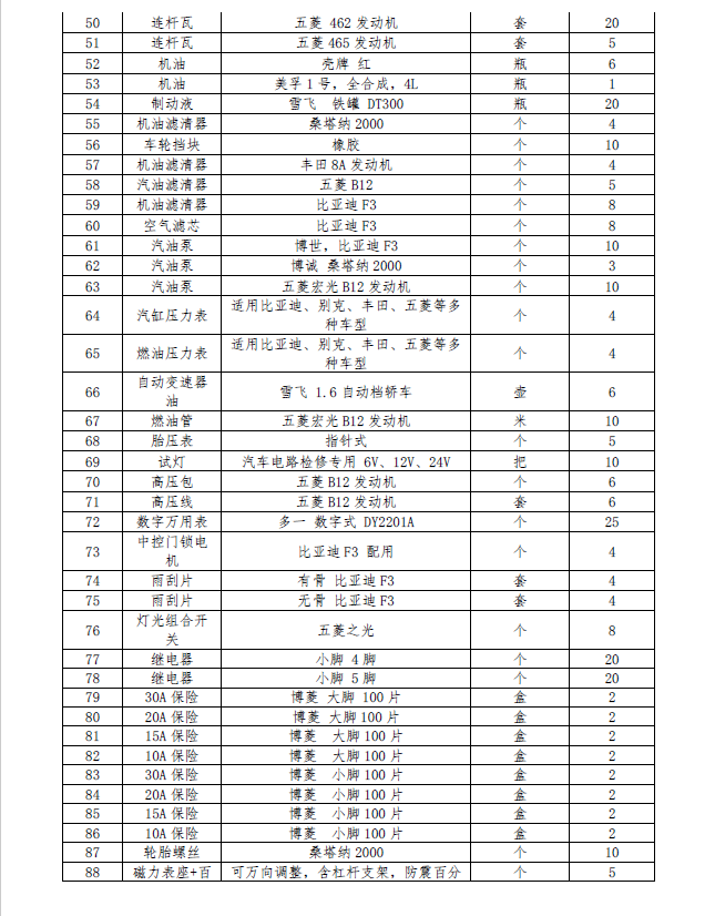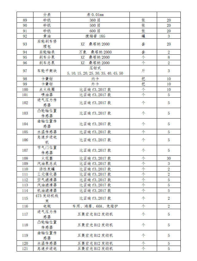 2018年秋季学期汽车类专业实训工具和耗材