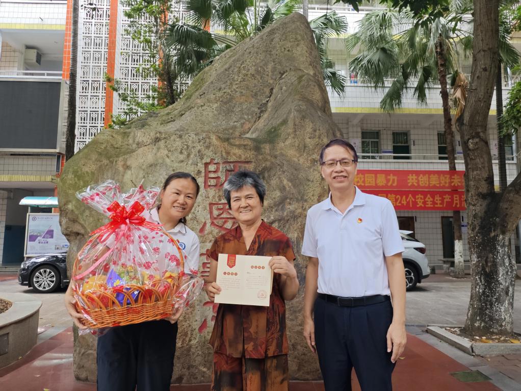 第五党支部慰问退休党员黄芳红老师(中)