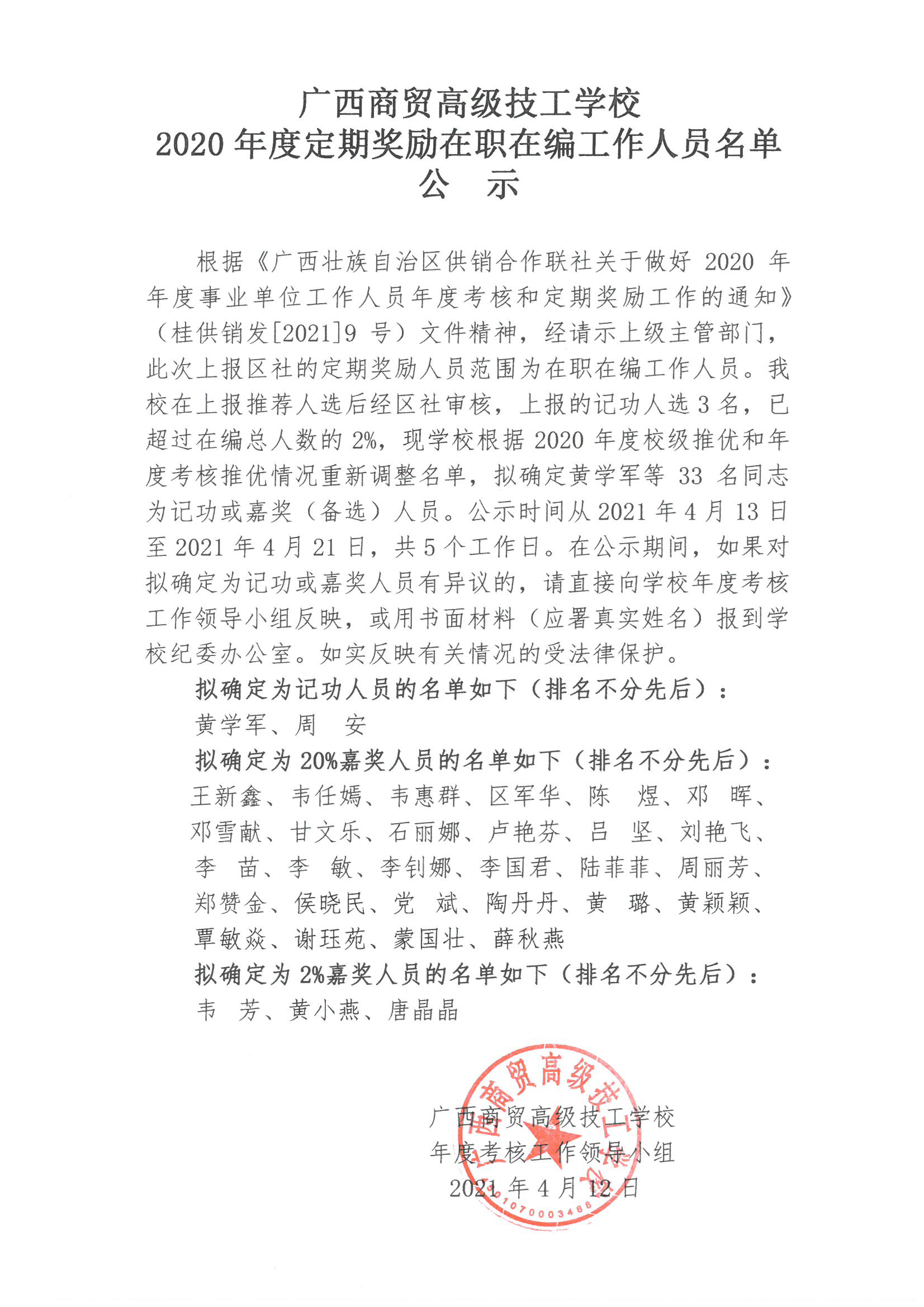 广西商贸高级技工学校2020年度在职在编人员记功嘉奖名单公示