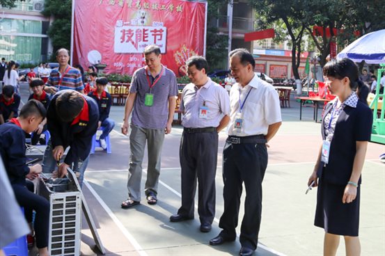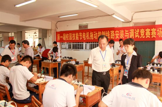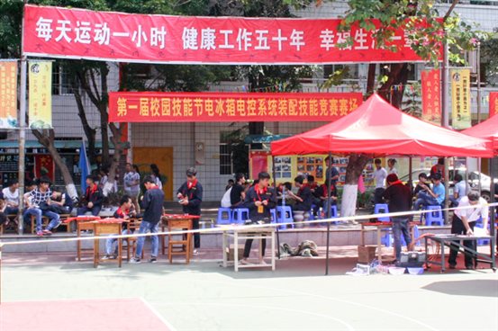 2016年6月3日8点20分,黄学军校长宣布广西商贸高级技工学校第一届技能节开幕;8点40分,在学校第一、二球场机电与电子教研室的技能竞赛项目开始有序地进行。竞赛项目分别有电冰箱电控系统装配与调试、控制线路安装与调试、电子线路安装与调试、汽车手动变速器拆装与检修、汽车电控系统装配与调试。比赛分初赛和复赛两个阶段,利用上课时间从教研室所属的制冷设备安装与维修、电子技术应用、汽车电器维修三个专业的14、15级各班中,分别选拔出10名选手参加复赛。机电与电子教研室的黄植凡、 黄世涛 、 姚敏 、冯永章、梁雪英、陆明伟、李国君等老师担任裁判工作,并有序地组织各班没有比赛任务的同学在赛场旁观摩。本次竞赛,充分地展示并锻炼了选手良好的操作技能,为参加更高一级技能竞赛发现和储备人才,同时对学生提高学习操作技能的积极性也起到了很好的促进作用。