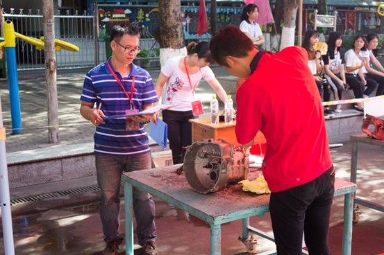 作为手动变速器拆装比赛的评委,李国君老师正在细致地评分