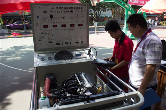 陆明伟老师在给参加汽车检修比赛的同学评分