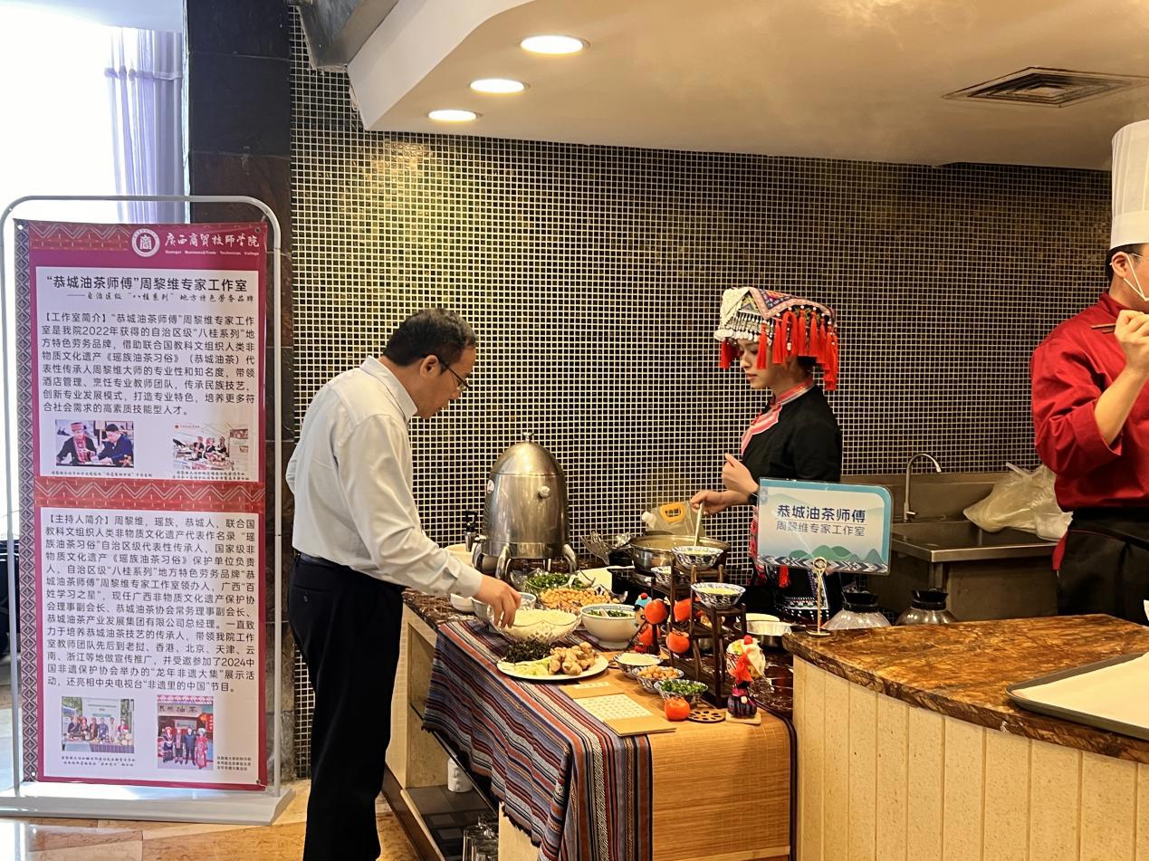 本次活动由广西壮族自治区人力资源和社会保障厅主办,集中展示全区14个设区市劳务品牌建设成果,并遴选“八桂系列”优质劳务品牌开展现场技艺交流。我院的恭城油茶师傅周黎维专家工作室凭借深厚的文化底蕴、精湛的制作技艺和显著的就业带动效应,成功入选交流推广项目邀请名单,由广西劳务品牌发展联盟统筹组织参与现场技艺展示。
