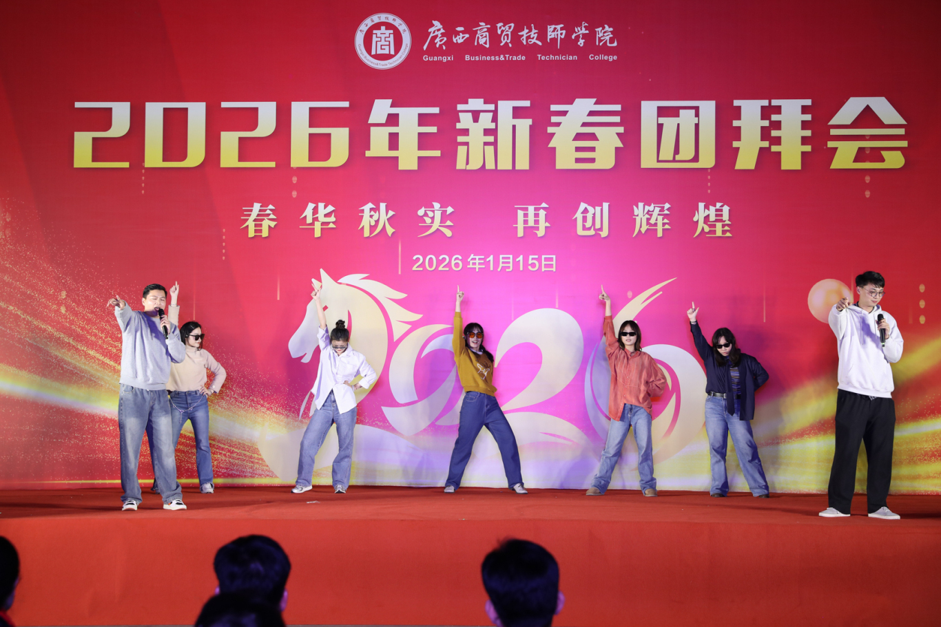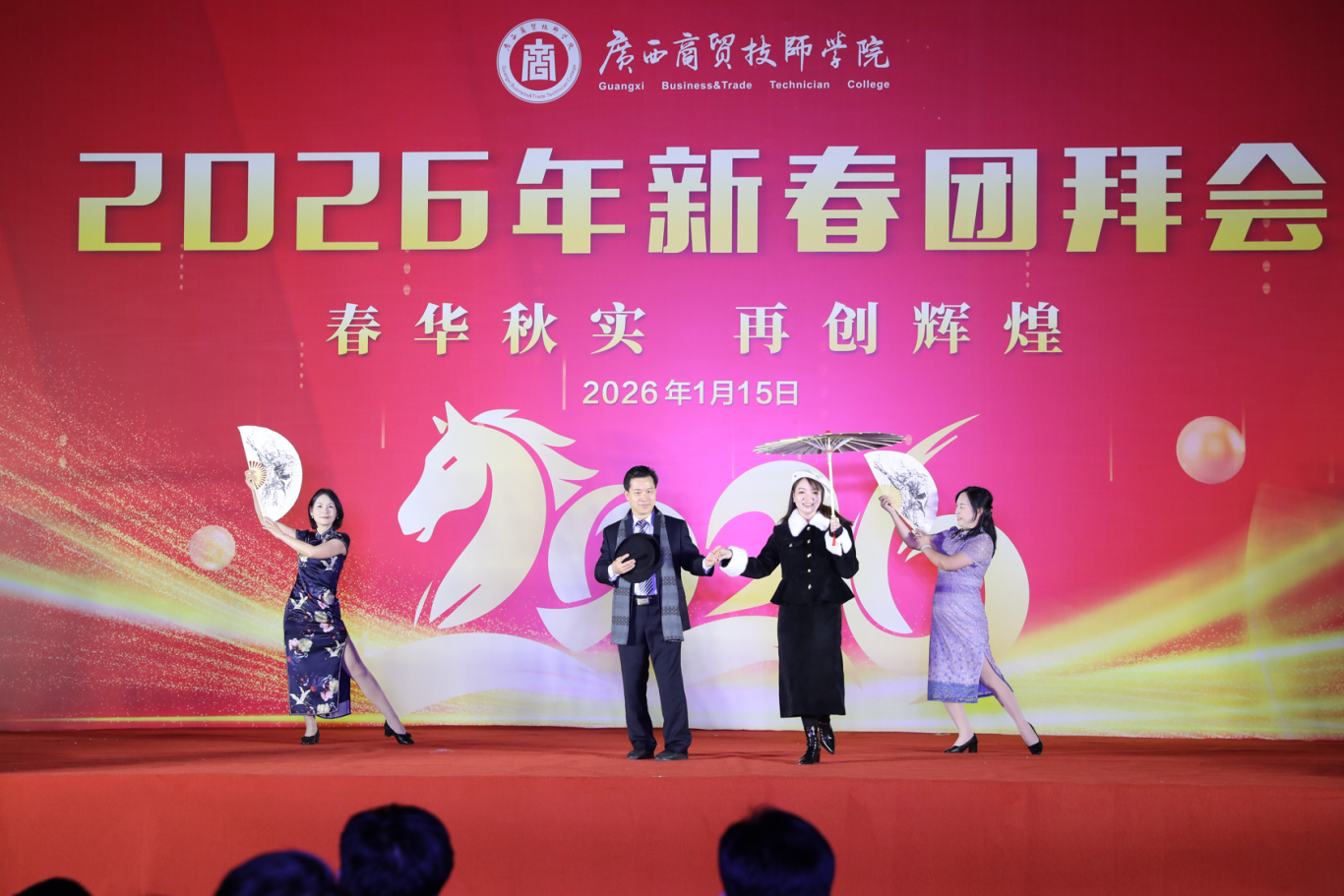 团拜会现场洋溢着温馨喜庆的氛围。演出在学院领导班子成员饱含深情的集体朗诵中拉开序幕,他们以铿锵有力、气势磅礴的诵读,表达了对学院发展的坚定信念和对全体教职工的新年祝福,为晚会奠定了昂扬奋进的基调。