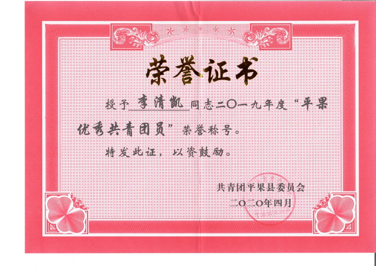 由于在志愿服务活动中,李清凯工作积极、表现突出,在平果县2020年优秀“抗疫”青年志愿者表彰大会中荣获“平果县优秀’抗疫’青年志愿者”称号及2019年度“平果优秀共青团员”荣誉称号。